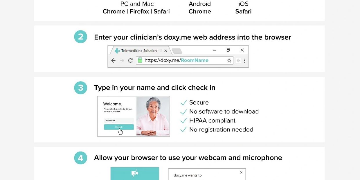 Please make use of this easy to follow You-Tube video, put out by Doxy.me, to make your experience as simple and easy as possible. Visit the Doxy.me website for in-depth information of the process.